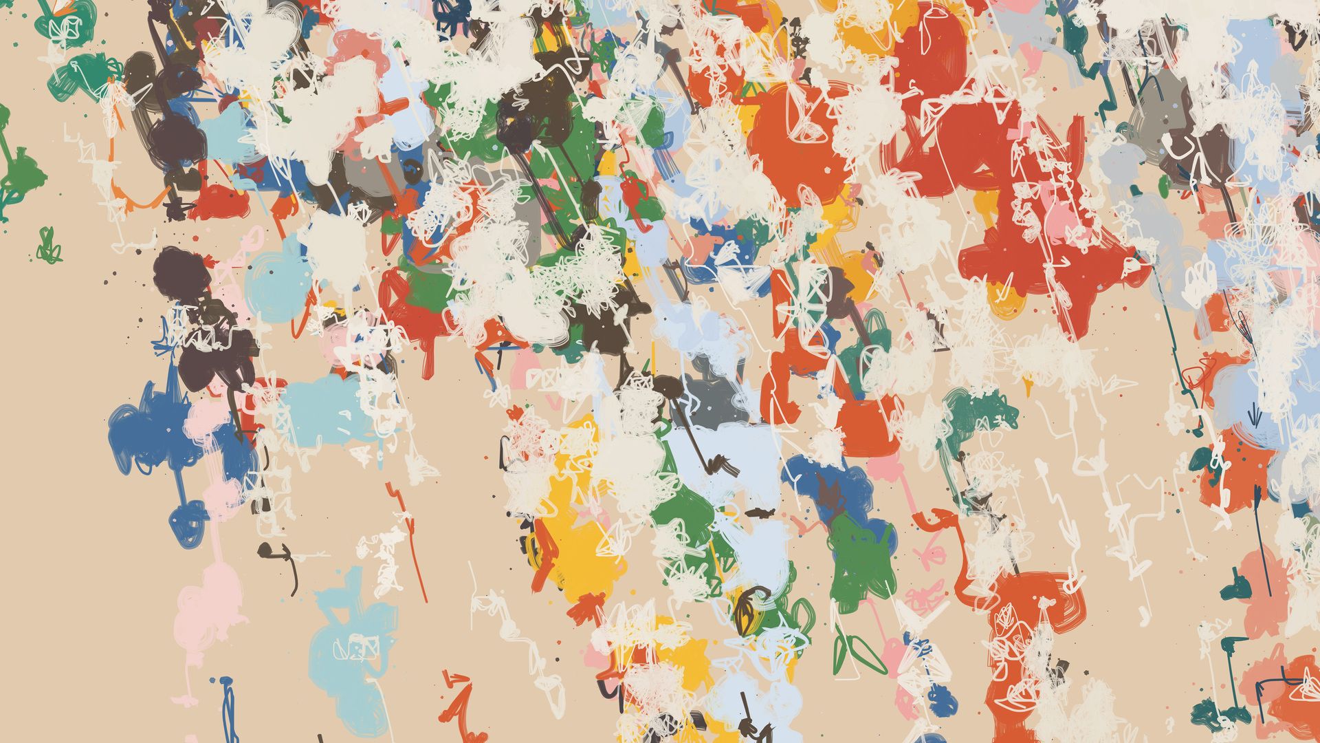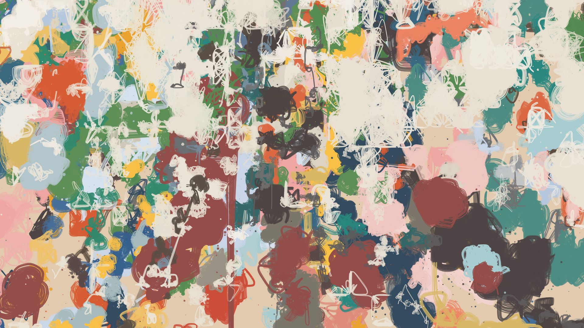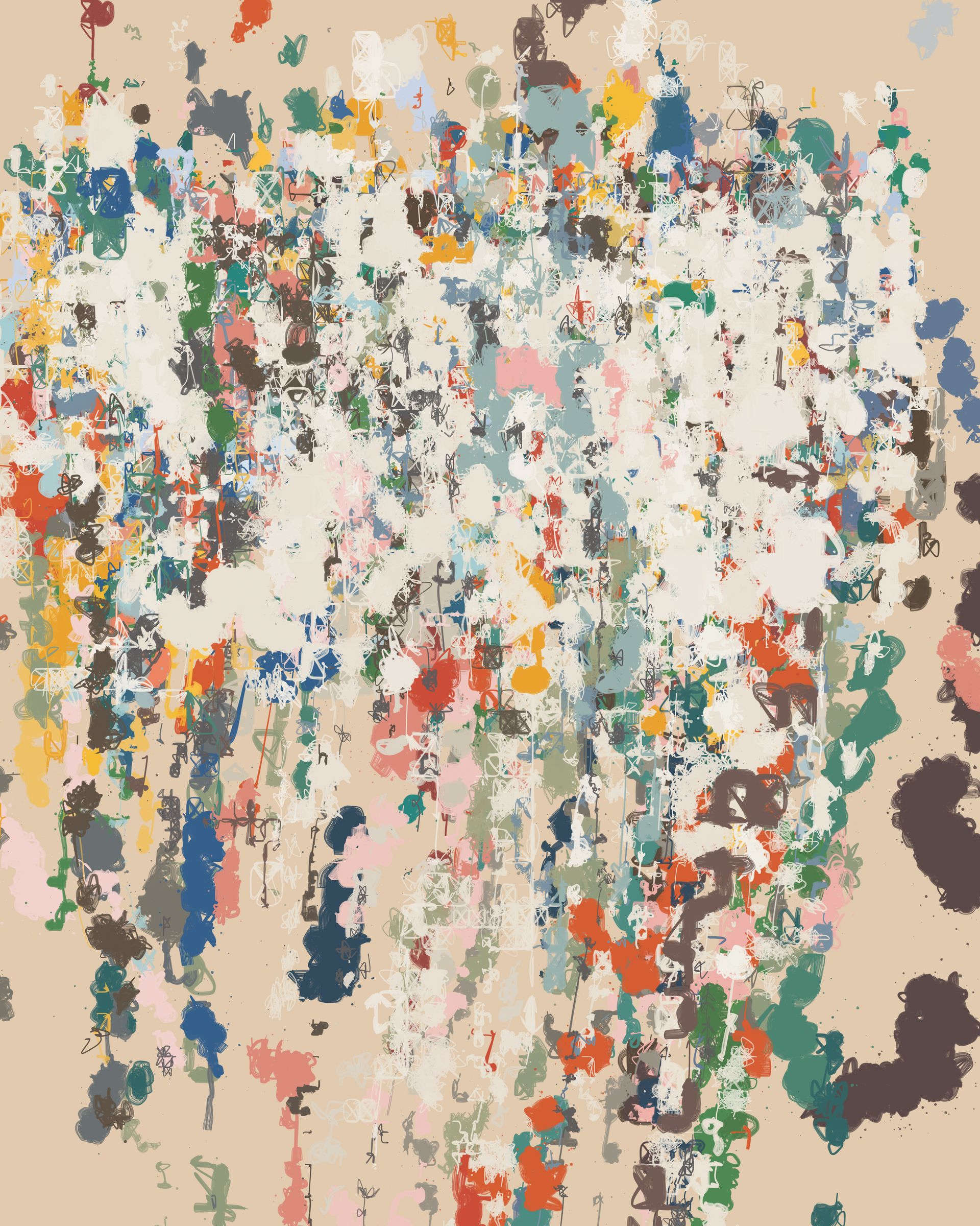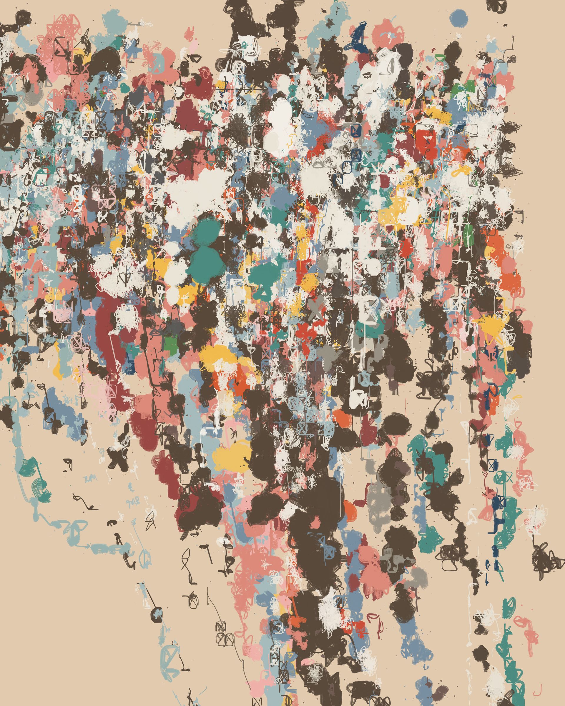 This work was inspired not only by the work of Mitchell and Twombly, but also by the density and chaos of urban graffiti and sticker spots. In those locations where scores of tags or hundreds of stickers compete for the same small piece of real estate, the aesthetic can somehow transcend its early state of noise and disorder, unexpectedly reaching a state of complex harmony. The lack of overall design seems to promote a type of anarchistic equality, with all of the different visual elements similarly jostling for attention. Each mark had its color chosen independently from the rest, without consideration for potential clashes. And yet, as the clashes stack up, their individual importance eventually dissolves away. To stand out is to fit in.